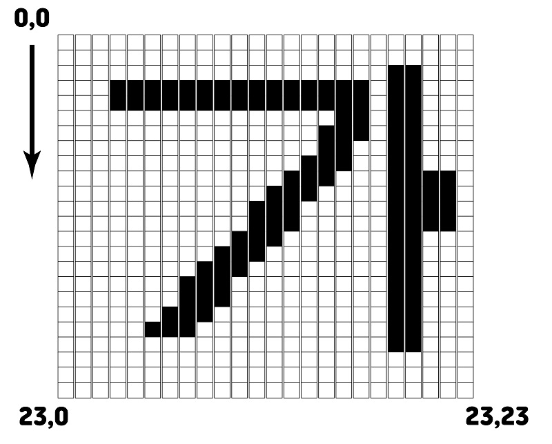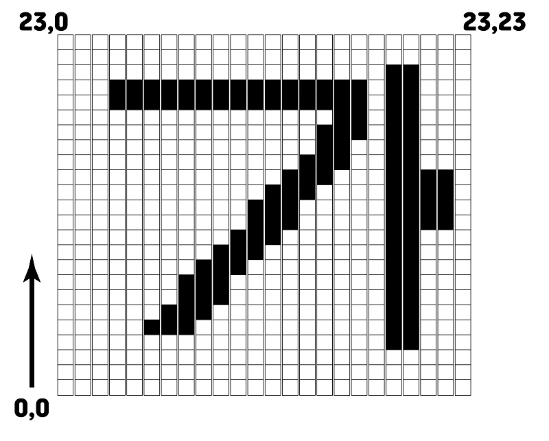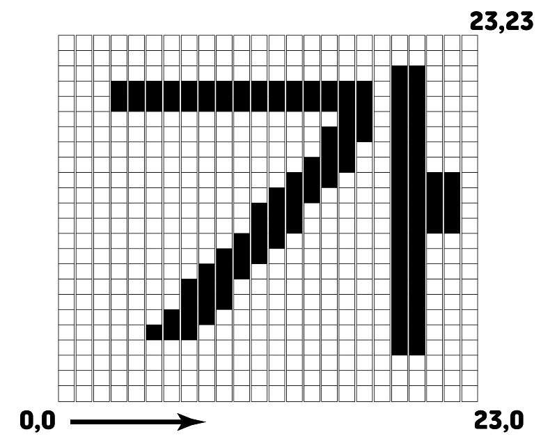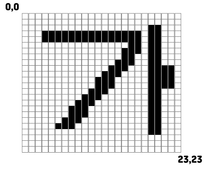 가로세로 모두 24픽셀로 특정 픽셀만 표시를 하여 '가'를 표시합니다. 그리고 한글 '가'를 표현하기 위해서는 아마 다음과 같은 코드들이 필요할겁니다. (아래 코드는 원리 이해의 예시로만 참고해주세요)