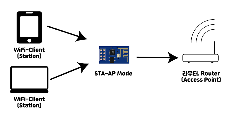 STA 모드는 쉽게 생각해서 공유기(AP)에 접속할 수 있게, AP에서 뿌리는 데이터 신호들을 받을 수 있는 모드를 뜻합니다. 따라서 STA 모드를 하게 되면 공유기와 같은 역할을 수행하지 못합니다.