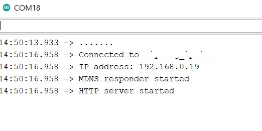업로드를 하고, 시리얼 모니터를 켜면, 와이파이에 접속됨을 알려줍니다. 와이파이에 접속되지 않으면 나타나지 않습니다. 그리고 local IP 값을 알려줍니다. 이 값을 복사하여 브라우저에 복사해 봅니다.