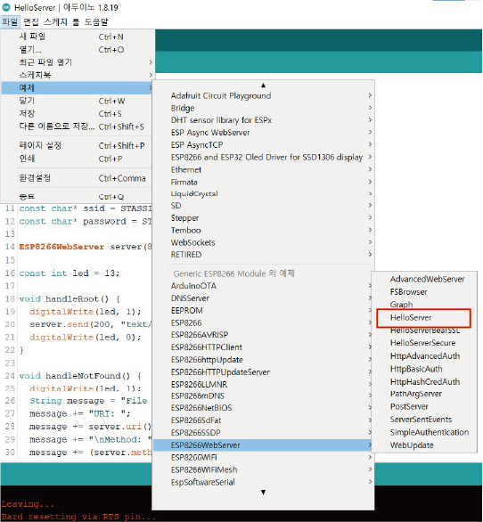 웹서버를 만드는 쉬운 예제가 있습니다. 파일-예제-ESP8266WebServer-HellowServer 입니다. 해당 예제를 선택해주면, 아래와 같은 코드들이 나타납니다.