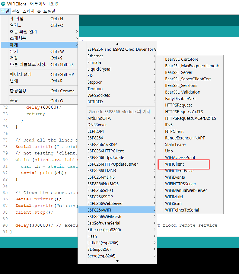 이번에는 wifi client - esp8266에 대해서 알아봅니다. 코드의 기능은 특정 서버에 데이터를 보내 응답을 받습니다. 따라서 esp8266은 client의 기능을 합니다.