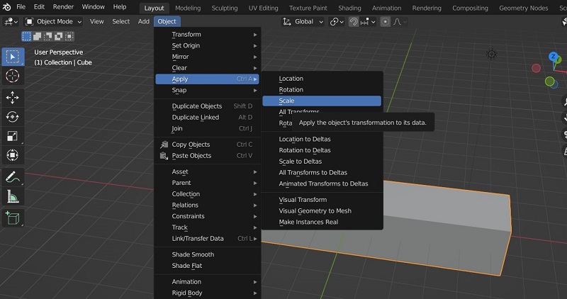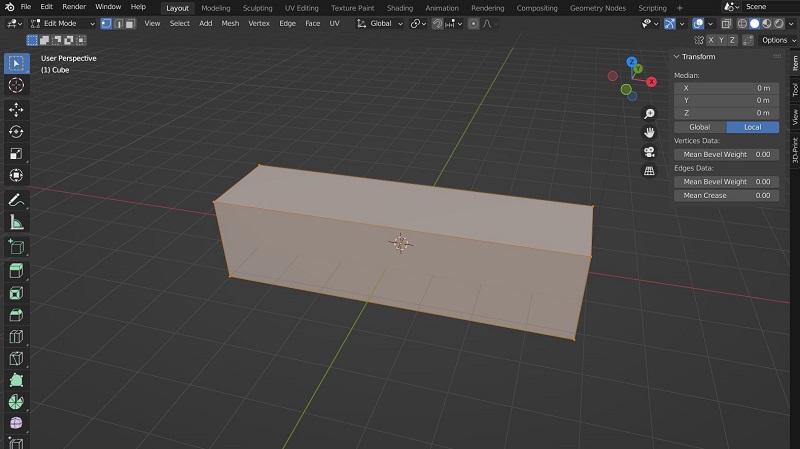 Edit mode에서 스케일을 변경하고, 다시 Object mode로 이동하면 Object mode에서 작업했을 때와는 다르게 Scale 값이 1로 되어 있음을 볼 수 있습니다.